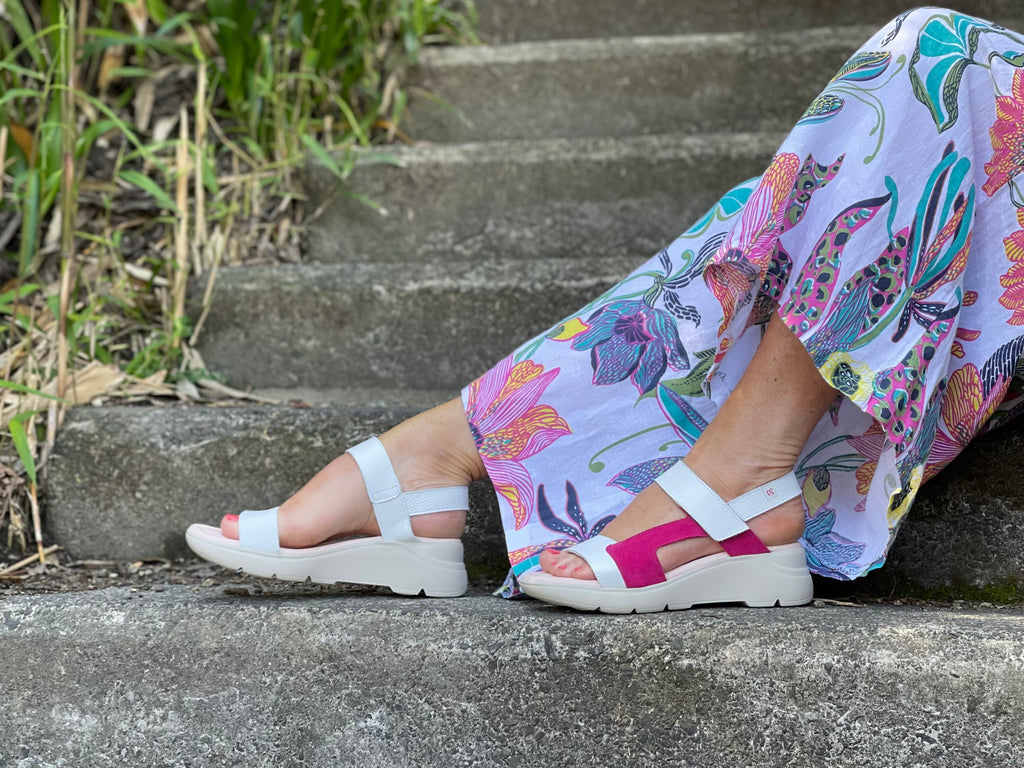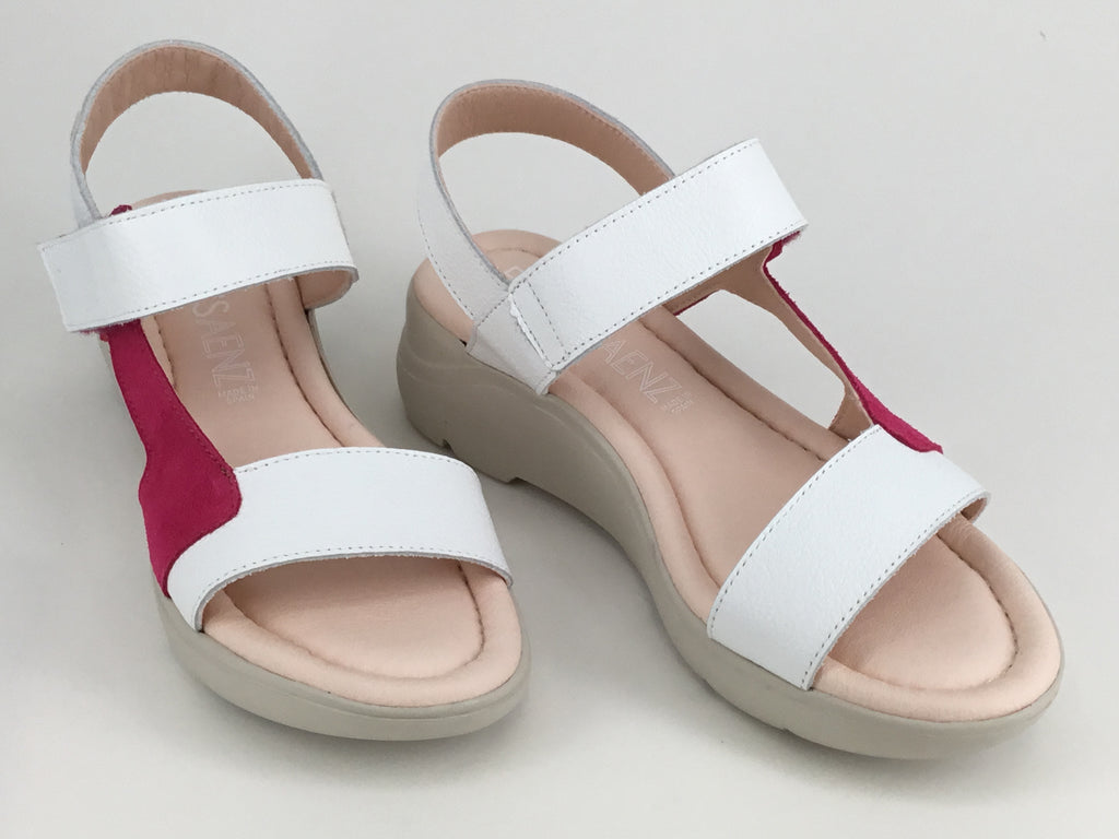 Pepe Saenz Paige. A pop of colour with all-day comfort. Made in Spain, this lightweight sandal combines practical design with playful detail. The 5.5cm wedge and 2.5cm platform give you comfortable height, while the padded sole cushions every step. An adjustable Velcro strap ensures a secure, easy fit, and the soft leather uppers are elevated with a bright pink suede side detail for a fun splash of colour. Perfect for summer days when you want comfort and style in equal measure.