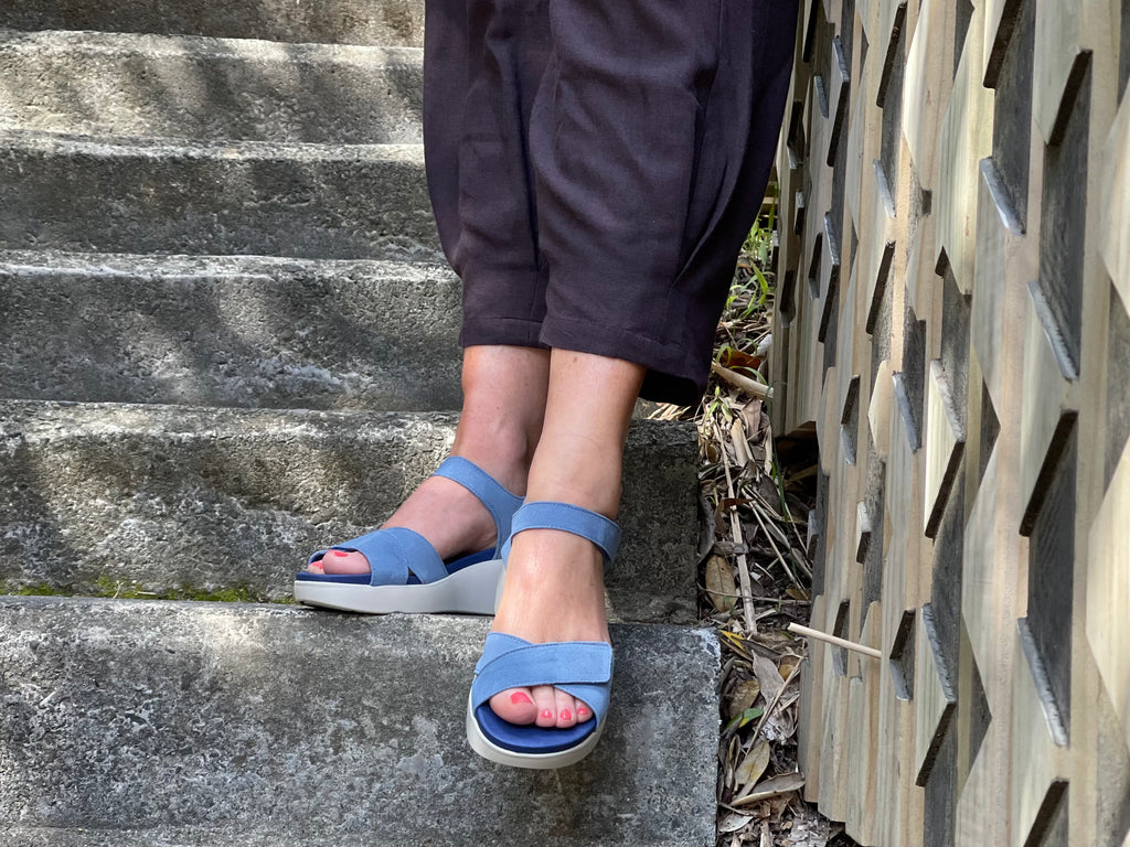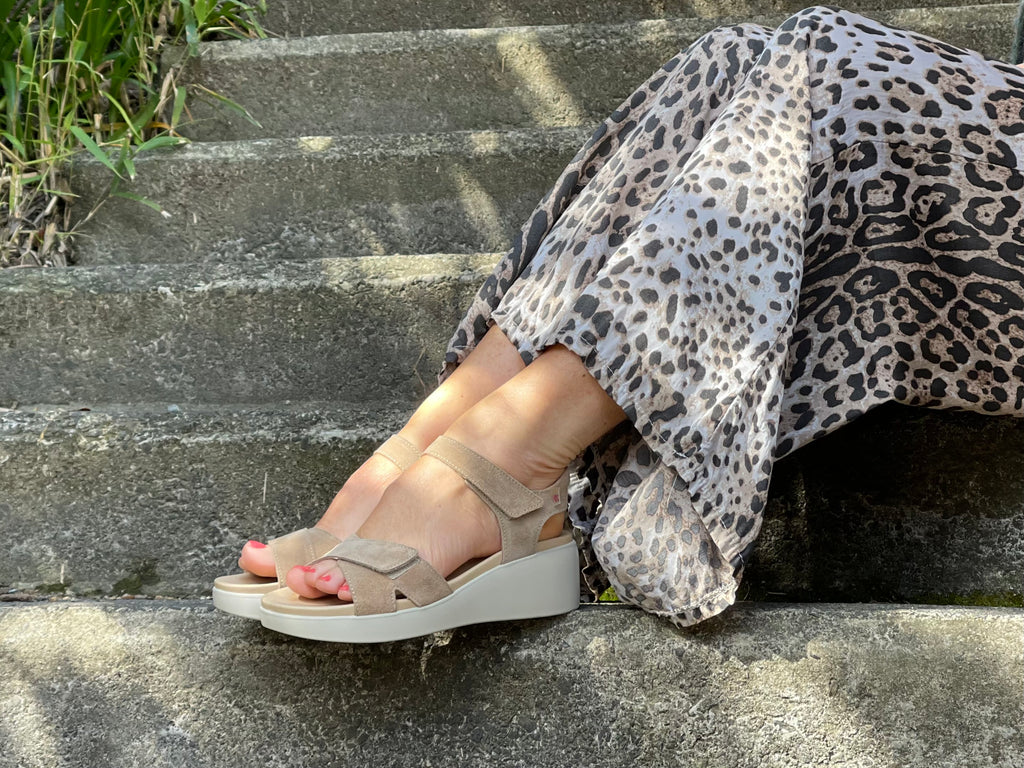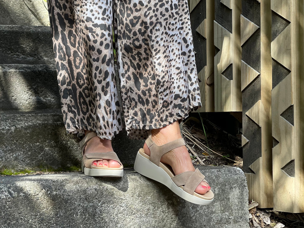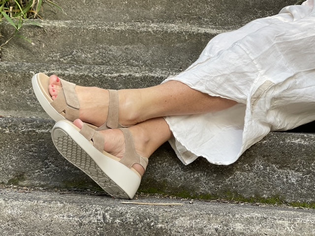Pepe Saenz Piper. Made in Spain, these suede leather sandals are the perfect blend of chic and practical. The lightweight 6cm wedge with a 3cm platform gives you height without the strain, while the padded moulded sole cushions every step. Designed with adjustable Velcro straps and extra padding at the Achilles, they offer a secure, custom fit for all-day wear. Soft suede uppers add a touch of luxury, making these sandals your go-to for summer outfits and travel adventures alike.