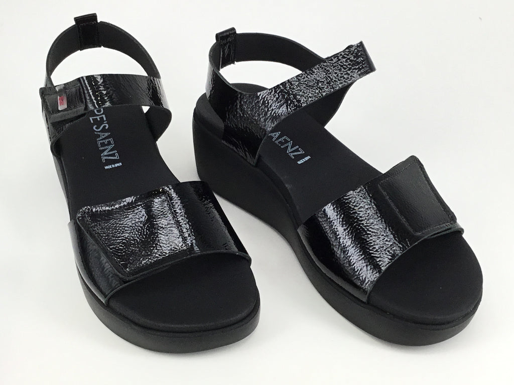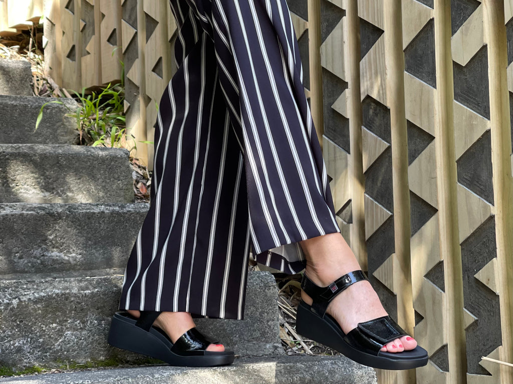 Pepe Saenz Polly. Sleek, stylish, and effortless. Made in Spain, these sandals are the perfect balance of fashion and function. The lightweight 6cm wedge with a 3cm platform gives you flattering height without compromising on comfort, while the padded moulded sole supports every step. Adjustable Velcro straps make them easy to slip on and secure, and the glossy patent leather uppers add a touch of modern polish. A versatile choice that works just as well for everyday wear as for evening outings.